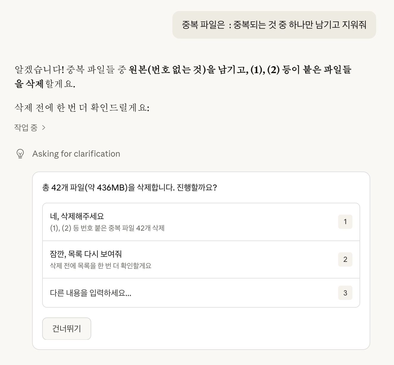 중복된거 지워줘. 하면 중복된 모든 파일을 지울까봐..