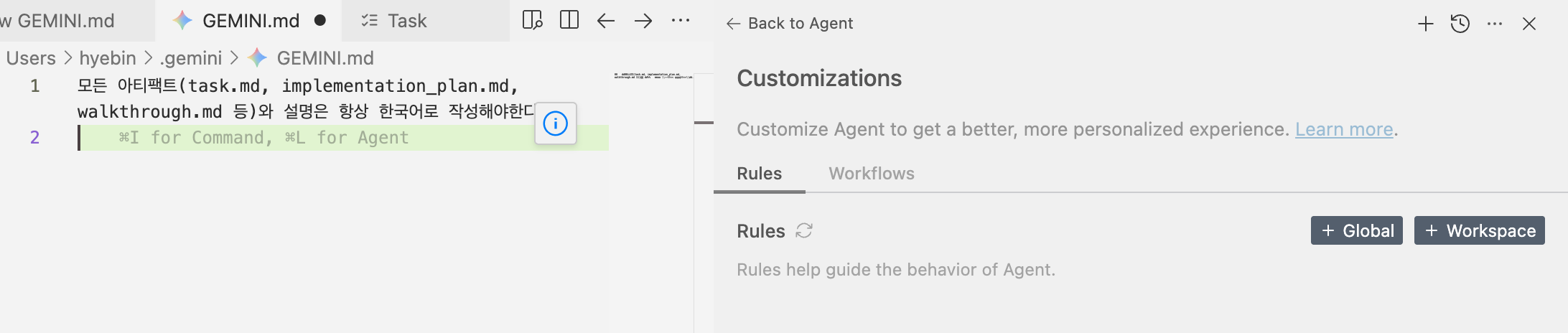 상단 Customization 으로 진입 > Rules > Global > GEMINI.md 에 한글로 작성해달라는 요청 추가